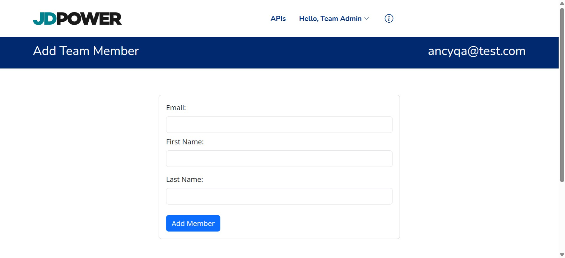 - Enter the team member’s email address, First and Last Name and click the Add Member button.