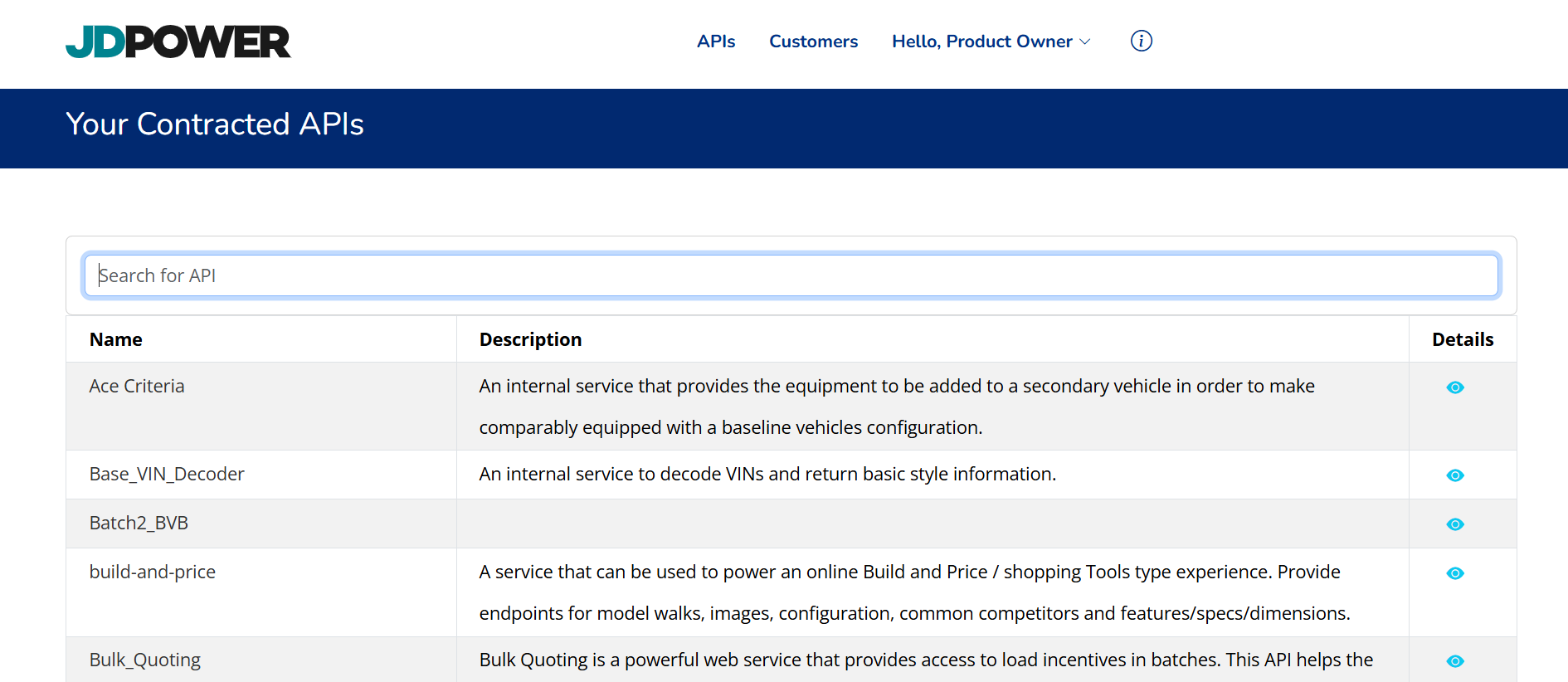 - Find the API you want and click the eye icon associated with it (under the Details column).